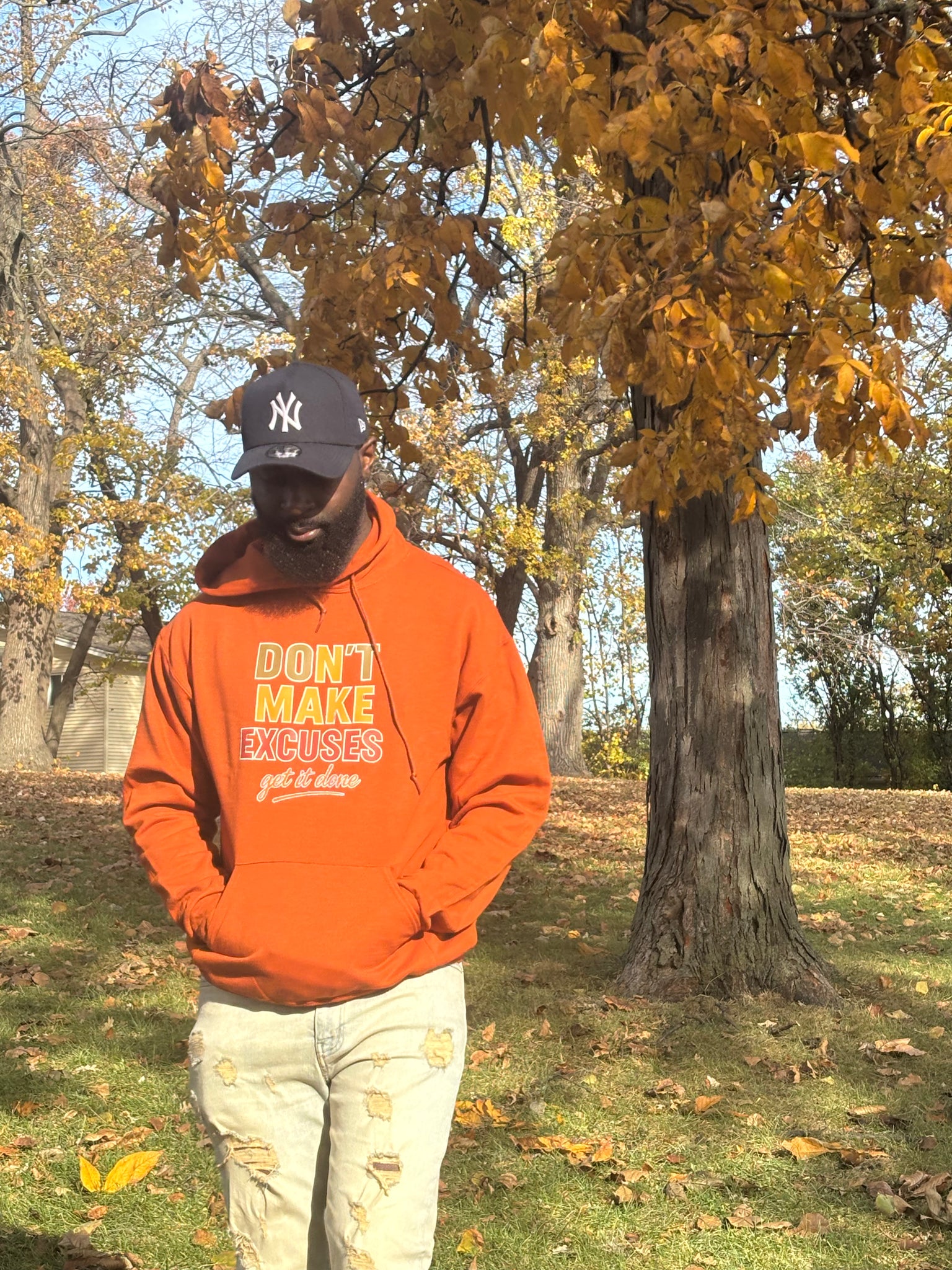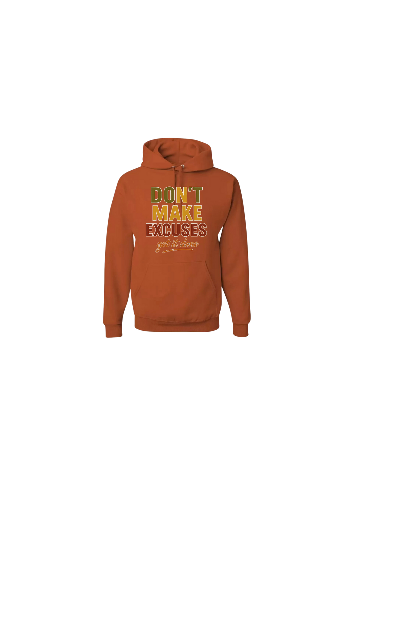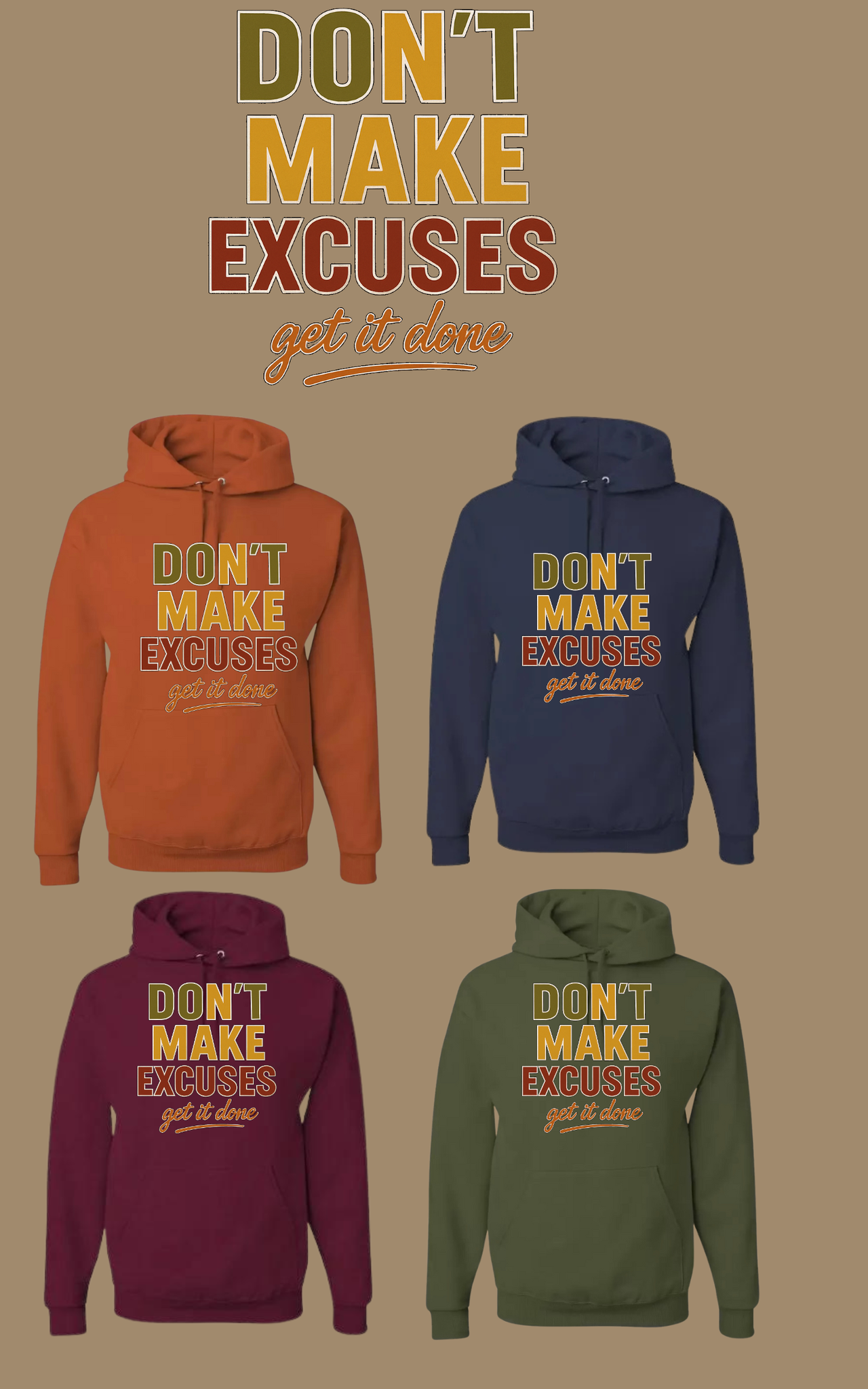 Upgrade your fall wardrobe with our "Don't make excuses, get it done" hoodies. Stay stylish while conquering your goals with this motivational design. Made with high-quality fabric, this hoodie will keep you warm and inspired. Available now!