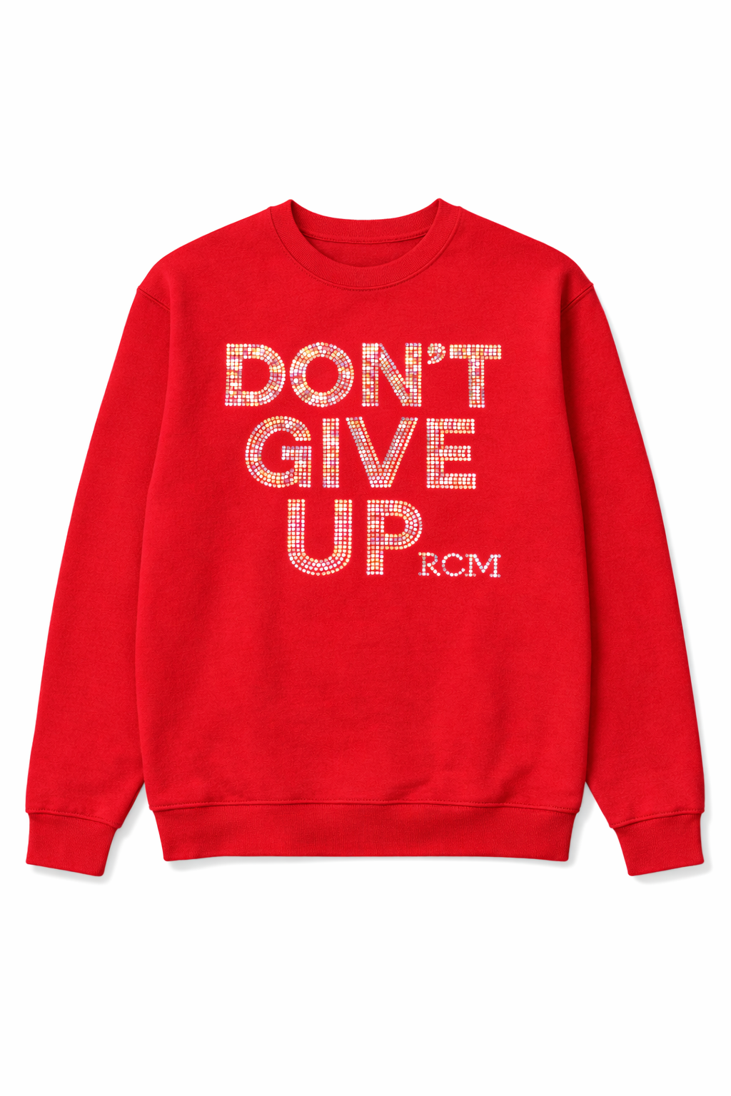 Each piece features the bold message “DON’T GIVE UP RCM” in premium rhinestones, with a pink crystal fill outlined by AB crystal shimmer for a stunning, color-shifting sparkle under any light.
