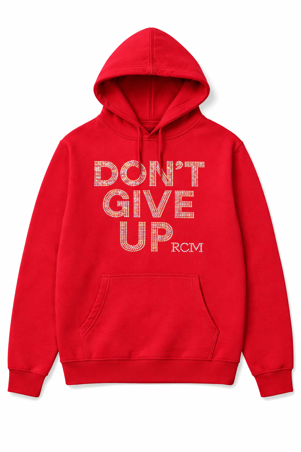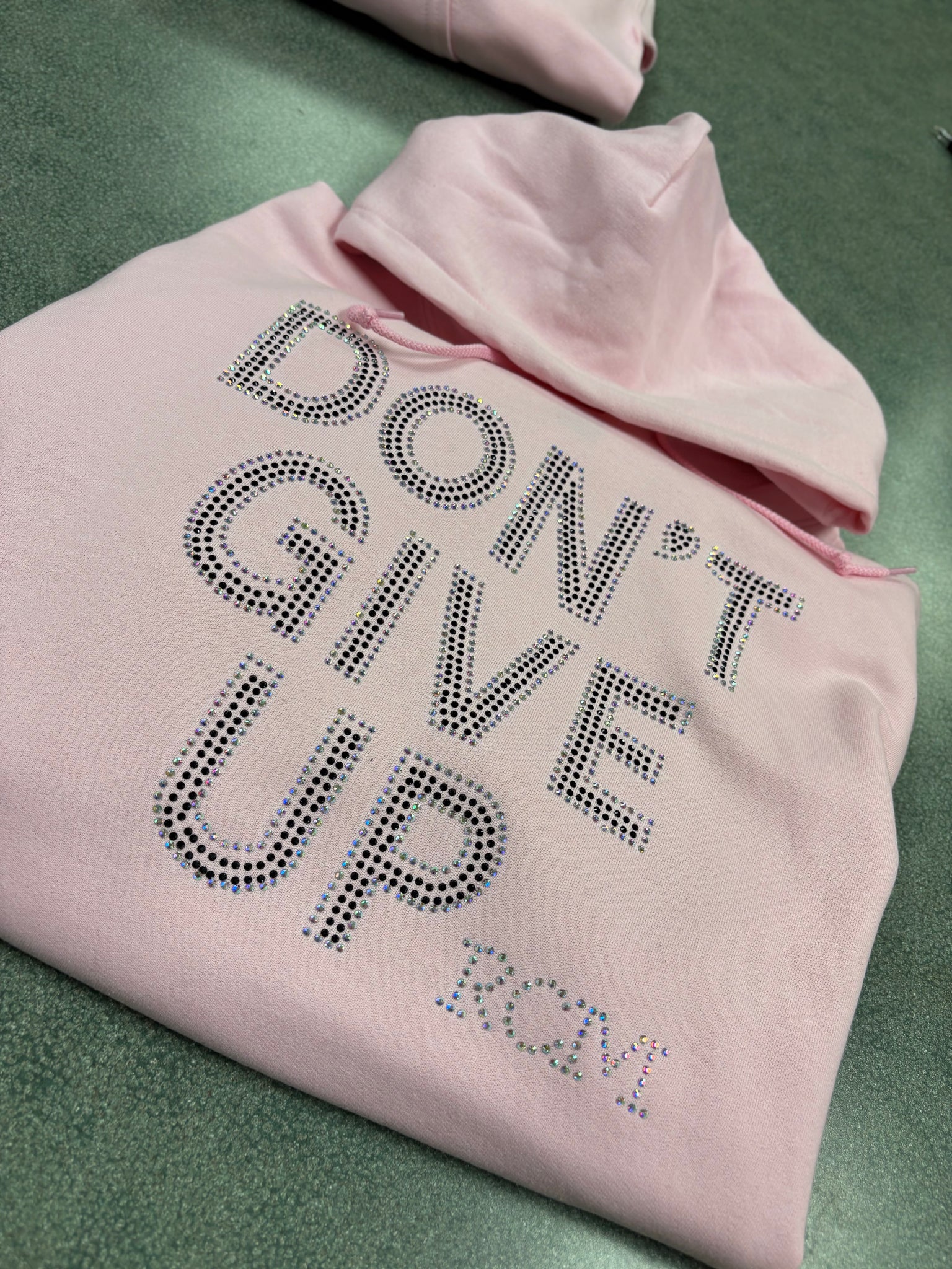 Each piece features the bold message “DON’T GIVE UP RCM” in premium rhinestones, with a pink crystal fill outlined by AB crystal shimmer for a stunning, color-shifting sparkle under any light.